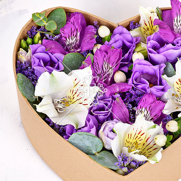 Белая  и фиолетовая альстромерия, лавандовая эустома, лунный  гиперикум, лимониум сдержанно-фиолетового оттенка и декоративная  зелень эвкалипта, оформлена в красивую коробку в форме сердца. Этот прекрасный сувенир поможет  признаться в любви и нежности, сделать комплимент, вручить  желанный подарок.