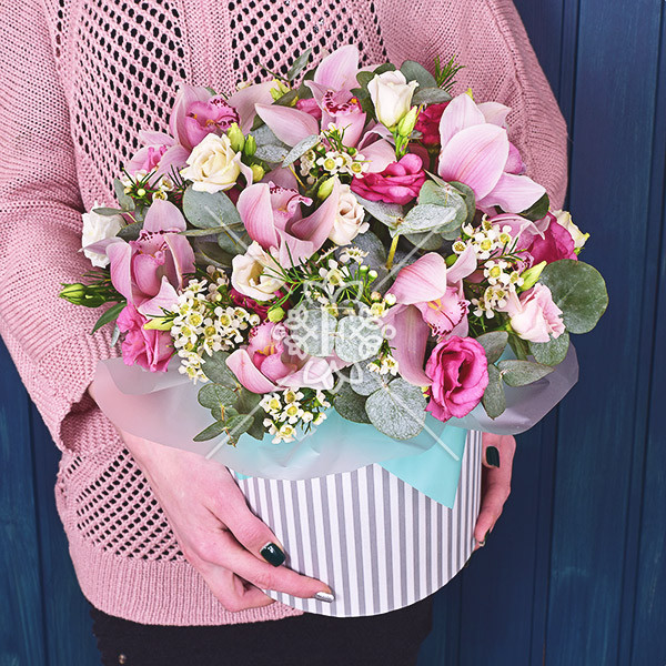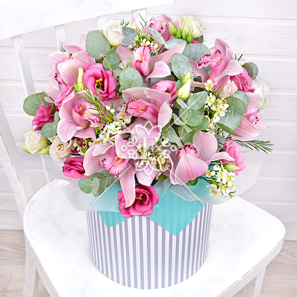 орхидея сиреневая – 13 шт., эустома розовая – 8 шт., зелень декоративная (хамелациум, эвкалипт), оазис, коробка.