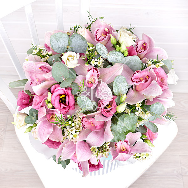 Чувственные розовые орхидеи , в окружении белых цветов  хамелациума, великолепно сочетаются с малиново-розовой эустомой.  Нежность и великолепие этой флористической фантазии подчеркивает сдержанная зелень эвкалипта. Вся композиция выглядит очень гармонично и привлекает к себе восхищенный взгляд!