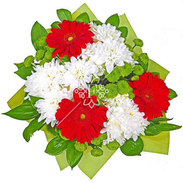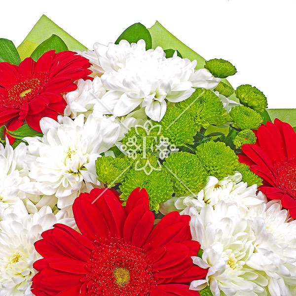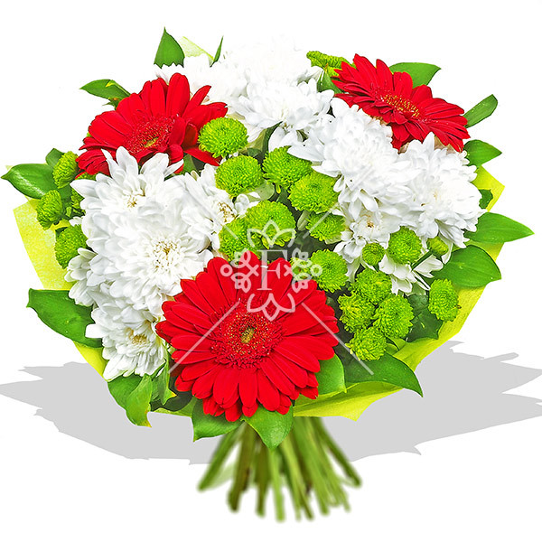 хризантема белая - 2 шт., хризантема зеленая - 1 шт., гербера красная - 3 шт., зелень декоративная (рускус), упаковка, лента.