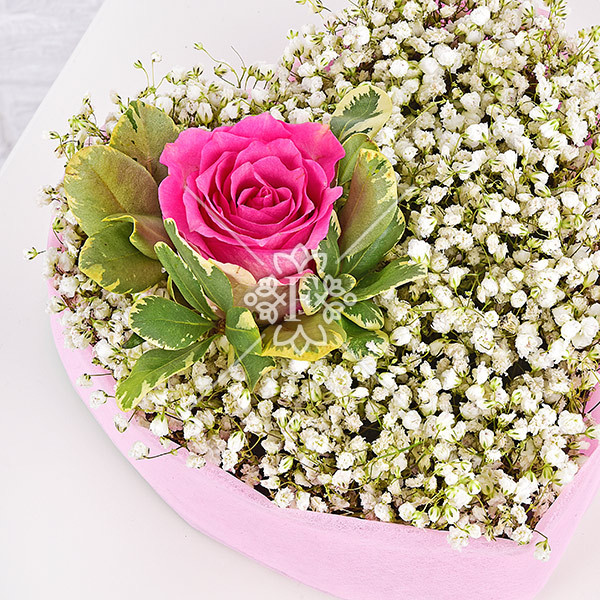 Представленная здесь белоснежная  гипсофила  выглядит легко и невесомо,  словно миллион восторженных фраз, сказанных для любимой. Но главный акцент композиции – прекрасная розовая роза в окружении зелени  питтоспорума! Композиция выглядит потрясающе нежно, привлекательно и мило.