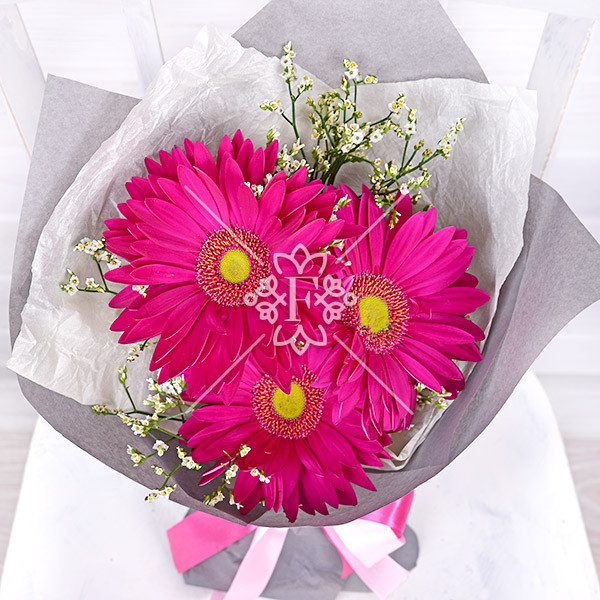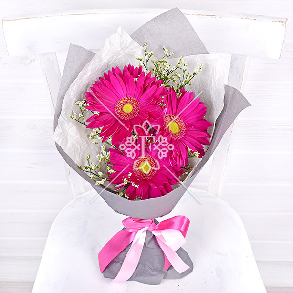 Гербера малиновая – 3 шт.,  лимониум белый – 1 шт., упаковка, лента.