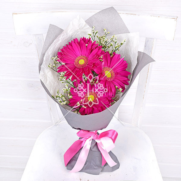 Букет из  малиновых гербер в сочетании с нежным лимониумом белого оттенка, смотрится ярко, привлекательно и стильно! Это прекрасный знак внимания.