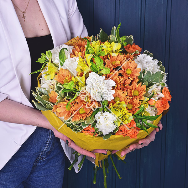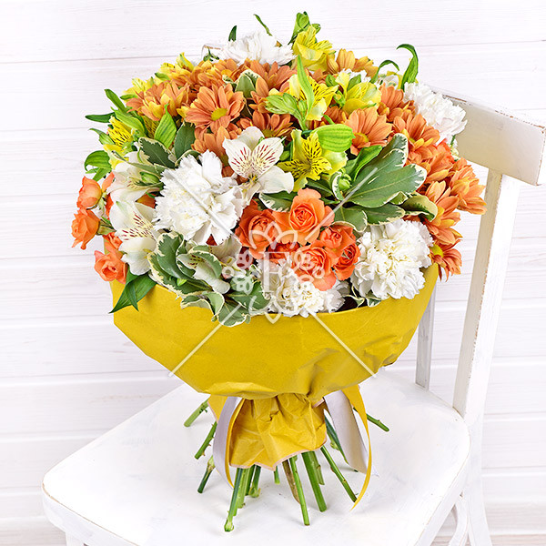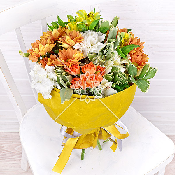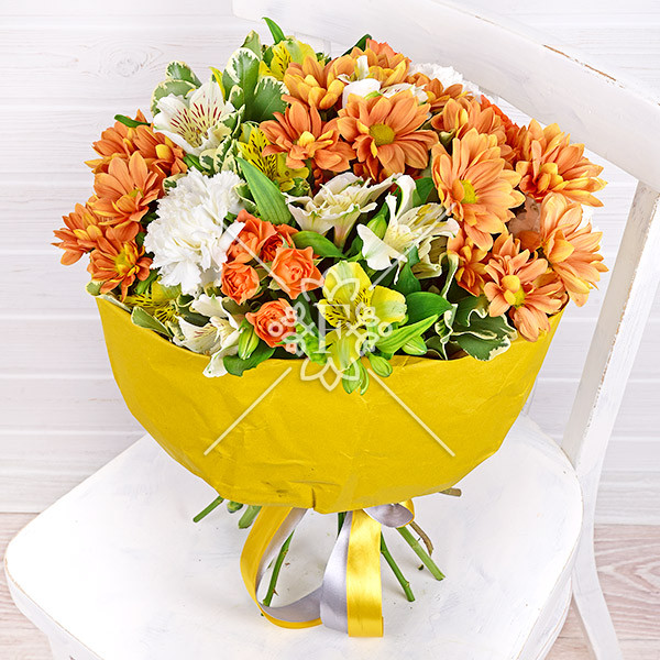 роза оранжевая кустовая – 1  шт., гвоздика белая – 2 шт., хризантема оранжевая кустовая – 2 шт., альстромерия желтая – 1 шт., альстромерия белая – 1 шт., зелень декоративная (питтоспорум), упаковка крафт, лента.